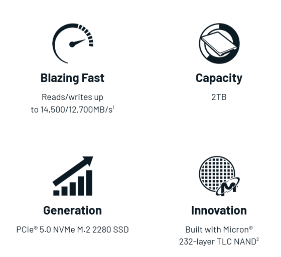 Conçu avec la NAND 3D TLC à 232 couches, le SSD Crucial T705 est optimisé pour les performances, tire pleinement parti de Microsoft DirectStorage, et est rétrocompatible avec les interfaces PCIe 3.0 et PCIe 4.0.